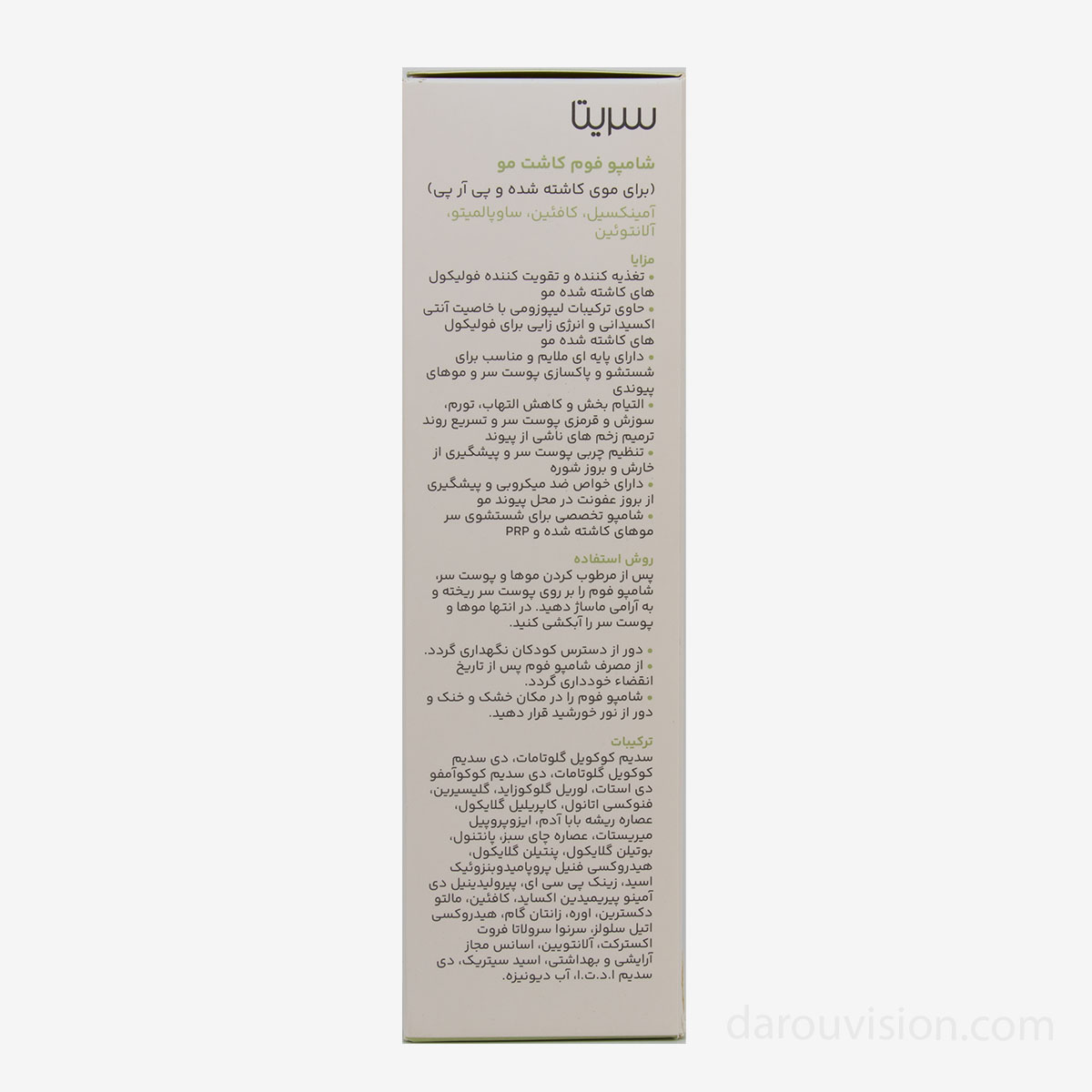 شامپو فوم ایمپلنت سریتا یک شوینده فوقملایم است که برای حفظ سلامت پیازهای تازهکاشتهشده طراحی شده. این محصول بدون نیاز به ماساژ شدید، آلودگیها و چربیها را برمیدارد و از التهاب، خارش و آسیب به فولیکول جلوگیری میکند.