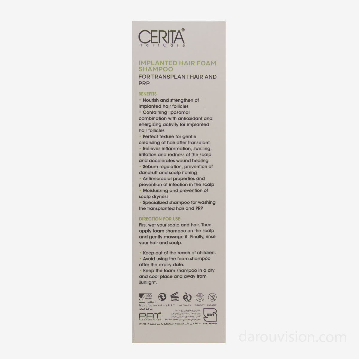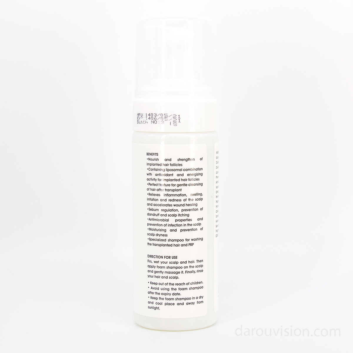 مقدار کافی از فوم را روی نواحی کاشتشده بریزید. بدون ماساژ، فقط اجازه دهید ۱–۲ دقیقه روی پوست سر بماند. با آب ولرم بهآرامی شستشو دهید. هفته اول کاملاً بدون ماساژ باشد.