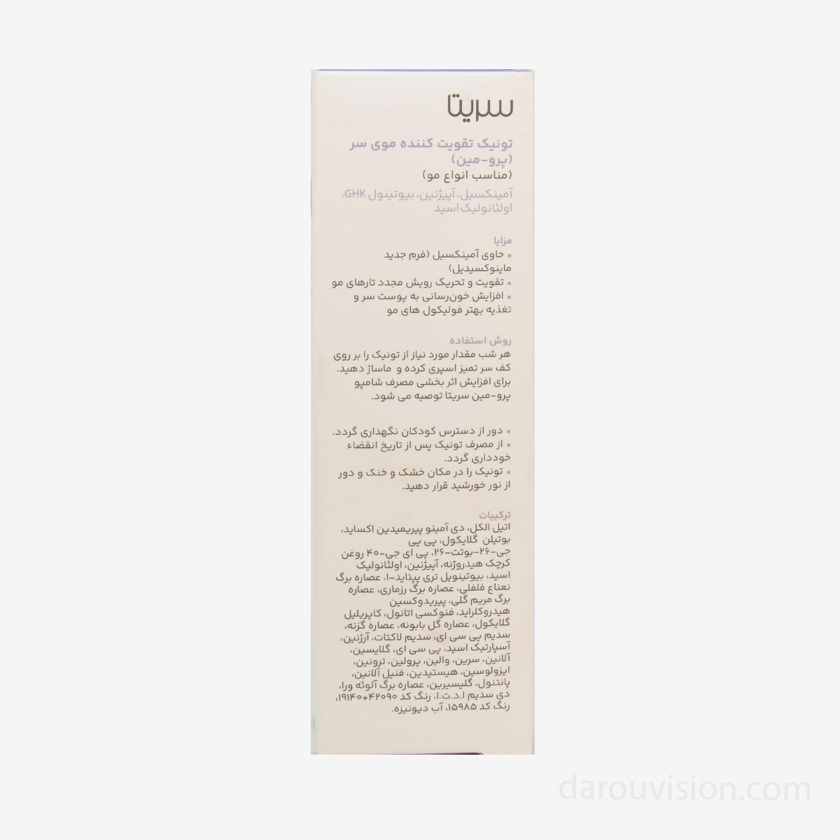 تونیک پرومین سریتا یک محلول ضد ریزش و تقویت کننده موست که با هدف کمک به افراد دچار ریزش یا نازک شدن مو ساخته شده است. این تونیک با ترکیب موادی چون آمینکسیل (فرمی از ترکیبات فعال ضد ریزش) اثر میکند: آمینکسیل با تأثیر بر ساختار مو و پوست سر، به تقویت فولیکولها و بهبود گردش خون کف سر کمک میکند.