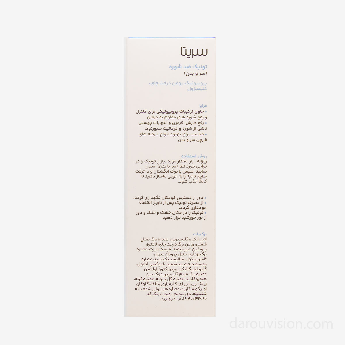 تونیک ضد شوره T1 سریتا، یک محلول درمانی برای کنترل شوره چرب و خشک، التهاب، خارش و پوستهریزی ناشی از رشد قارچ است. این تونیک علاوه بر سر، روی نواحی بدن که دچار درماتیت سبورئیک هستند نیز اثر درمانی دارد. فرمولاسیون آن برای استفاده روزانه و طولانیمدت مناسب است و باعث خشکی پوست نمیشود.