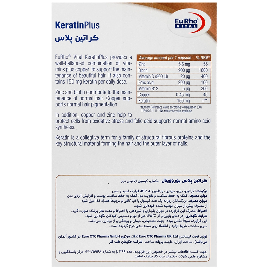 قرص کراتین پلاس یوروویتال (Eurho Vital Keratin Plus) یک مکمل تخصصی برای تقویت مو، جلوگیری از ریزش و کمک به رشد مجدد موهاست. این قرص با ترکیب مؤثری از کراتین، بیوتین، زینک، آمینواسیدهای ضروری و ویتامینهای B به تقویت ساختار مو، درخشندگی بیشتر و جلوگیری از شکنندگی موها کمک میکند. همچنین این مکمل در حفظ سلامت پوست و ناخنها نیز موثر است.