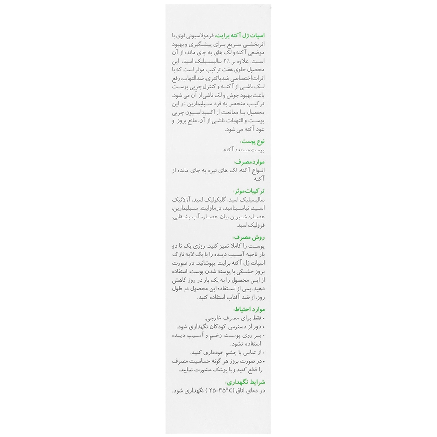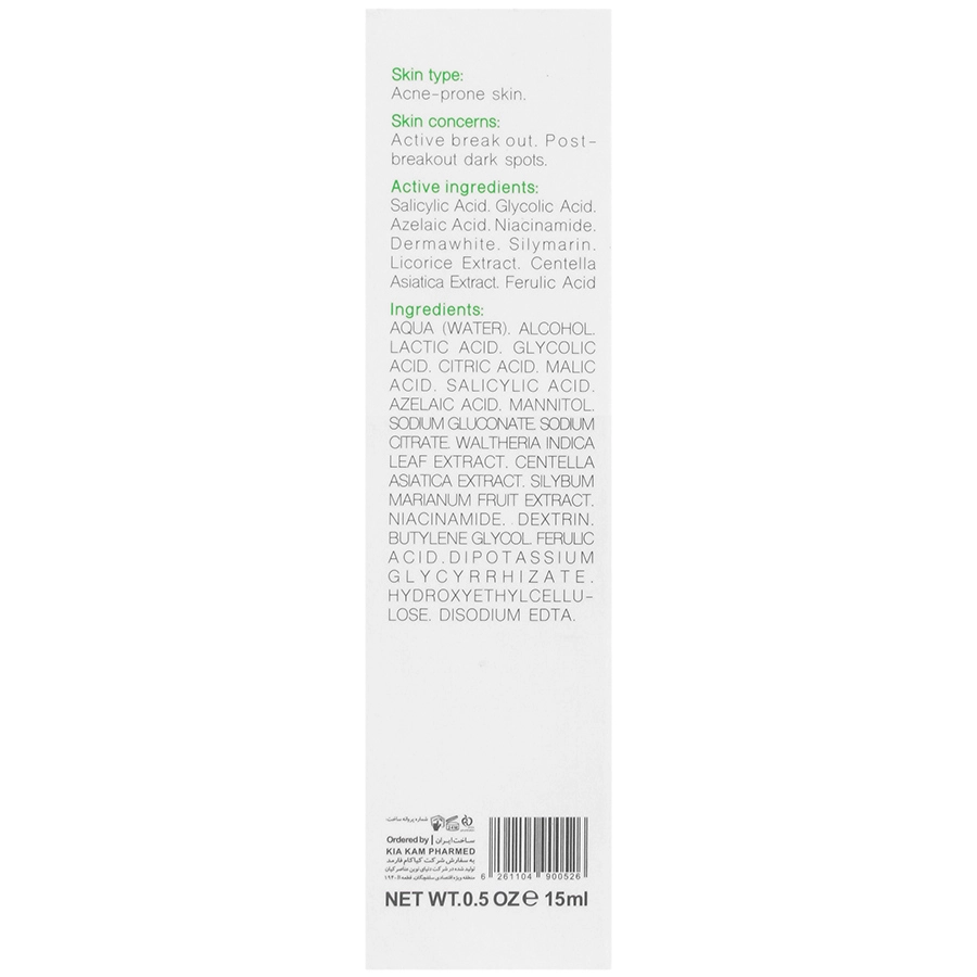 - ترکیبات پیشرفته: شامل اسید سالیسیلیک برای پاکسازی منافذ، عصاره چای سبز به عنوان آنتی اکسیدان قوی، عصاره آلوئه ورا جهت آرامبخشی و مرطوبکنندگی و سایر ترکیبات موثر که همگی در یک فرمولاسیون منحصر به فرد گرد آمدهاند.