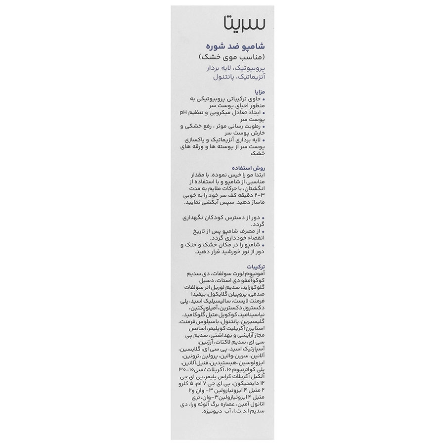 شامپو ضد شوره پروبیوتیک موهای خشک سریتا یک شامپوی تخصصی است که با فرمولاسیون پیشرفته و ترکیب پروبیوتیکها به درمان و پیشگیری از شوره سر کمک میکند و در عین حال موهای خشک را به خوبی تغذیه و نرم میکند. این محصول با حفظ تعادل فلور میکروبی پوست سر، شوره را کنترل کرده و باعث افزایش سلامت و شادابی موها میشود.