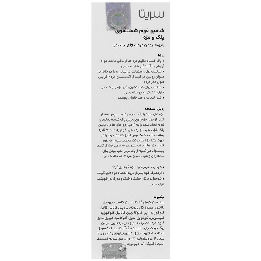 شامپو فوم شستوشوی پلک و مژه سریتا، پاککنندهای ملایم و تخصصی برای حذف آلودگیها، چربی و آرایش از ناحیه حساس چشم، بدون ایجاد حساسیت یا خشکی.