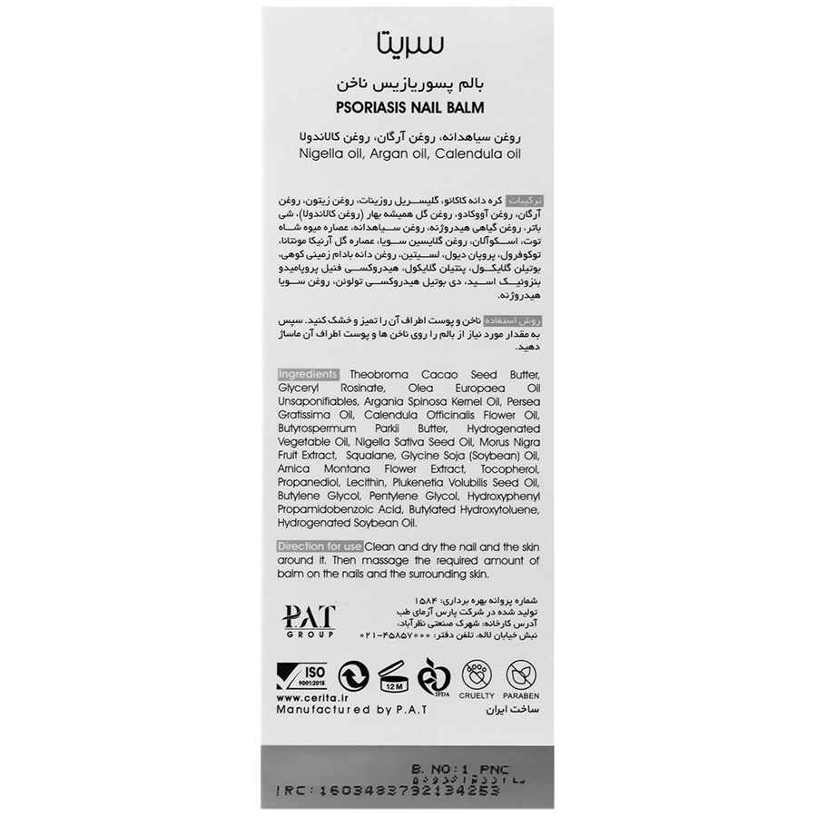 بالم پسوریازیس ناخن سریتا یک درمان موضعی تخصصی برای کنترل و تسکین علائم ناخن مبتلا به پسوریازیس است. پسوریازیس ناخن میتواند باعث ضخیم شدن، تغییر رنگ، پوستهریزی و ایجاد حفره روی ناخن شود. این بالم با بهرهگیری از ترکیبات گیاهی و ضدالتهاب مانند عصاره بابونه، بید سفید و روغن درخت چای، به کاهش قرمزی، خارش، التهاب و تقویت ساختار ناخن کمک میکندوفرمولاسیون سبک و جذب سریع این محصول، بدون ایجاد چربی، استفادهی راحتی دارد و مناسب برای استفادهی روزانه است. با استفادهی مداوم، ظاهر ناخنها بهبود یافته و علائم آزاردهندهی بیماری به طور چشمگیری کاهش مییابد.