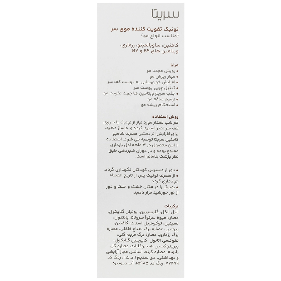 بعد از شستن مو و خشک کردن نسبی، مقدار مناسبی از تونیک را روی پوست سر اسپری یا ماساژ دهید و بدون نیاز به شستشو بگذارید خشک شود. روزی یک تا دو بار استفاده شود. - آیا استفاده از تونیک تی2 سریتا محدودیت سنی دارد؟