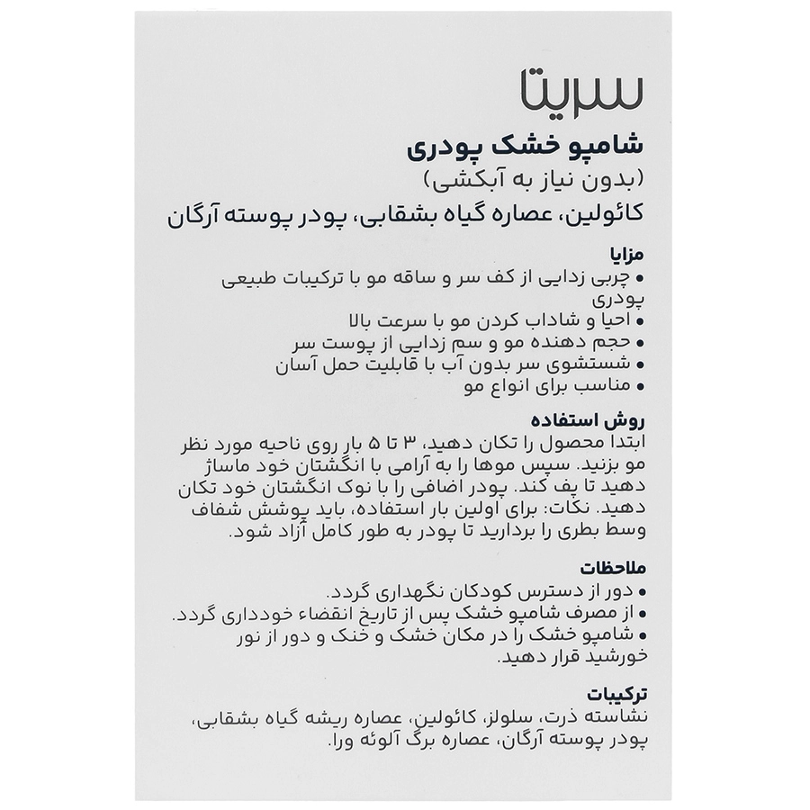 شامپو خشک پودری سریتا، راهکار سریع و آسان برای تازه و تمیز کردن موها بدون نیاز به شستشو با آب. مناسب برای استفاده در مواقعی که وقت کافی برای شستن موها ندارید.