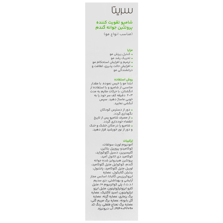 شامپو سریتا با فرمولاسیون حاوی مواد طبیعی مانند عصاره جوانه گندم و پروتئینهای گیاهی تهیه شده و فاقد سولفاتهای قوی و پارابن است (در صورت تایید محصول اصلی).