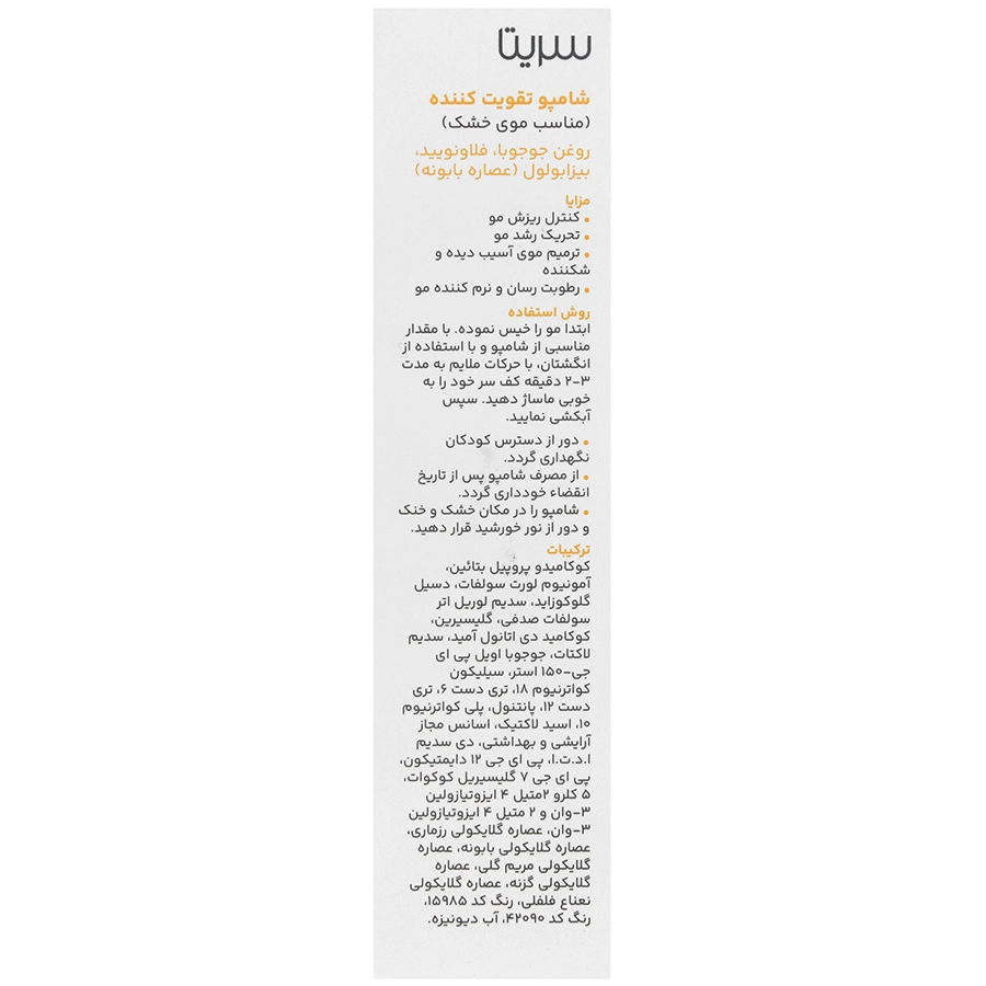 شامپو تقویت کننده موی خشک سریتا، انتخابی بینظیر برای داشتن موهایی نرم و درخشان است. با آبرسانی عمیق و حفظ رطوبت، موهای شما را از ریشه تا نوک تقویت میکند. فرمولاسیون ویژه آن، خشکی و زبری را از بین برده و لطافت و شادابی را به موهایتان برمیگرداند. تجربهای نوین در مراقبت از مو!