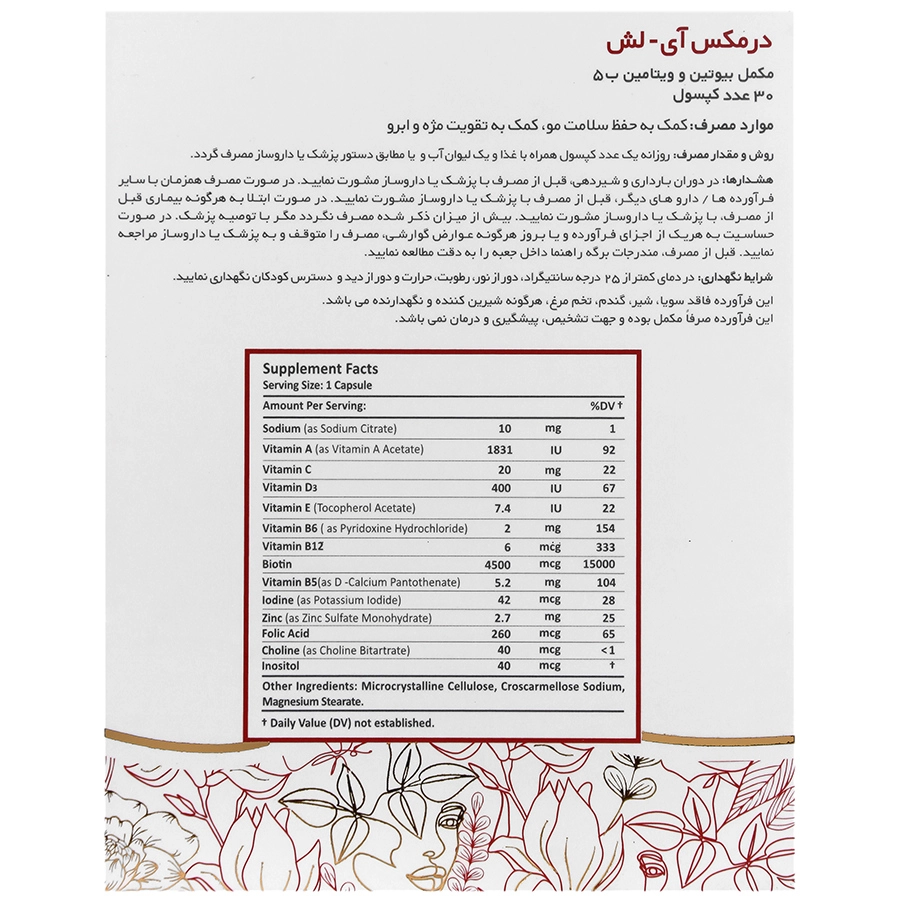 کپسول درمکس I-Lash یک مکمل غذایی طراحیشده برای حمایت از سلامت و رشد مژه و ابرو است. فرمول آن شامل ویتامینهای محلول در آب و چرب، ریزمغذیها (زینک، ید) و ترکیبات سلولی مانند اینوزیتول و کولین است که هدفگذاریشان تأمین نیازهای تغذیهای فولیكولهای مو و کاهش شکنندگی و ریزش بوده است .