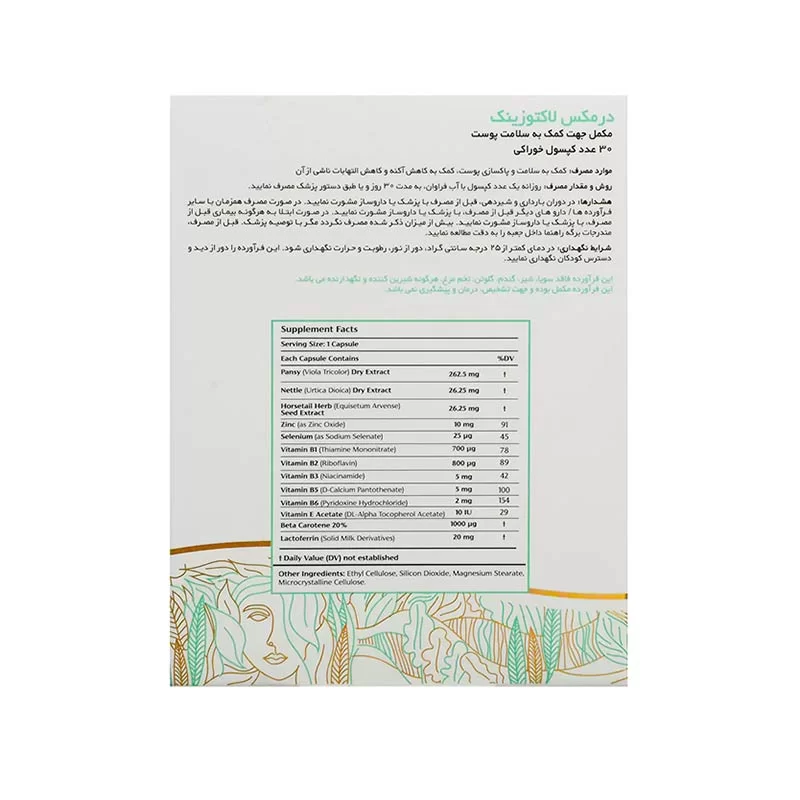 "درمکس لاکتوزینک (Dermax Lactozinc)" مکمل تغذیهای ویژه پوست است که با ترکیب علمی از روی، لاکتوفرین و عصارههای گیاهی، به کاهش التهاب، کنترل آکنه و بهبود ظاهر پوست کمک میکند. حاوی ویتامینهای گروه B و آنتیاکسیدانهایی است که با تقویت سد دفاعی سلولها، نقش مؤثری در حفظ شادابی و شفافیت پوست دارند.