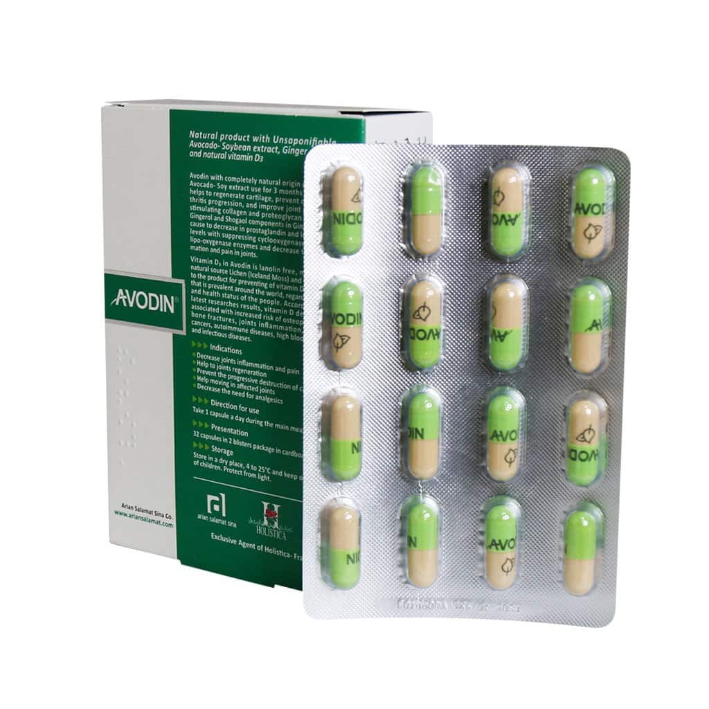 کپسول آوودین آرین سلامت سینا با منشا کاملاً طبیعی حاوی عصاره آووکادو سویا به مدت 3 ماه تا 3 سال، با تحریک ساخت کلاژن و پروتئوگلیکان باعث بازسازی غضروف، کاهش سرعت پیشرفت استئوآرتریت و کاهش دردهای مفصلی می گردد. ترکیبات موجود در زنجبیل، با مهار آنزیم های سایکلواکسیژناز و لیپواکسیژناز سبب کاهش سطح پروستاگلاندین ها و لوکوتری ان ها میشوند و در نتیجه التهاب و درد را کاهش می دهند.