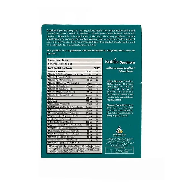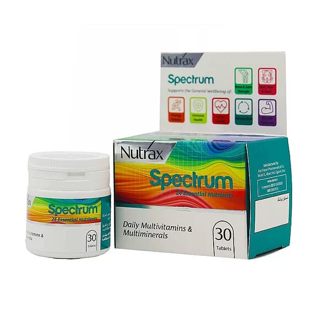 کپسول نوتراکس اسپکتروم Nutrax Spectrum یک مولتیویتامین کامل و پیشرفته است که برای تأمین نیازهای روزانه بدن به انواع ویتامینها و مواد معدنی طراحی شده است. این مکمل با داشتن ترکیب متعادل از ویتامینهای گروه B، ویتامین C، ویتامین D3، ویتامین E، زینک، سلنیوم، منیزیم و سایر ریزمغذیها، نقش مؤثری در حفظ عملکرد سیستم ایمنی، افزایش انرژی، بهبود سلامت پوست، مو و ناخن و پیشگیری از ضعف عمومی دارد.